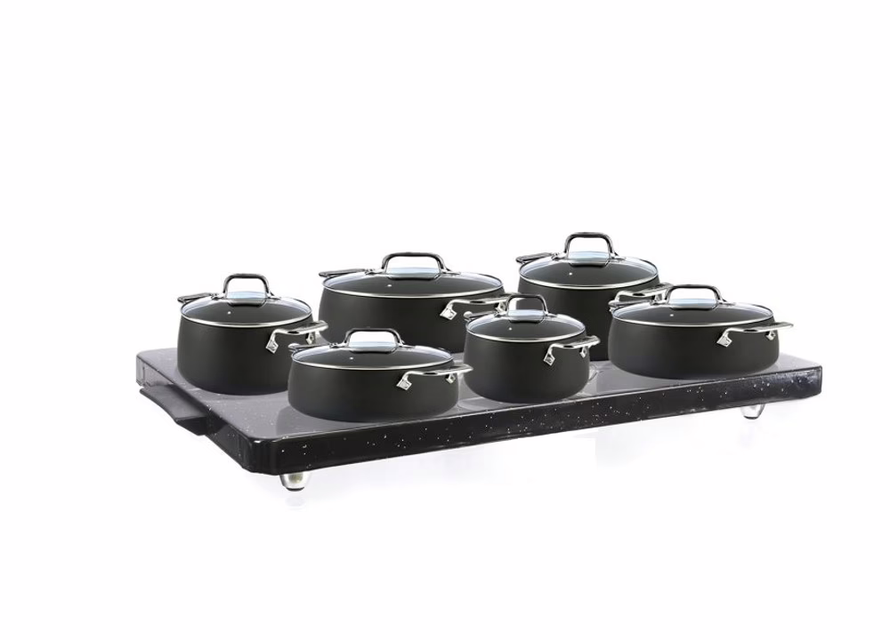 פלטת שבת המיועדת לשישה סירים וכוללת מערכת חימום השומרת על רמת חום אחידה.