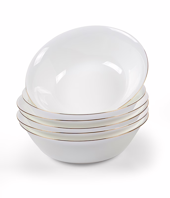 סט קערות עגולות בעיצוב נקי ואלגנטי בגוון לבן בוהק שאינו דוהה ובעיטור פס זהב